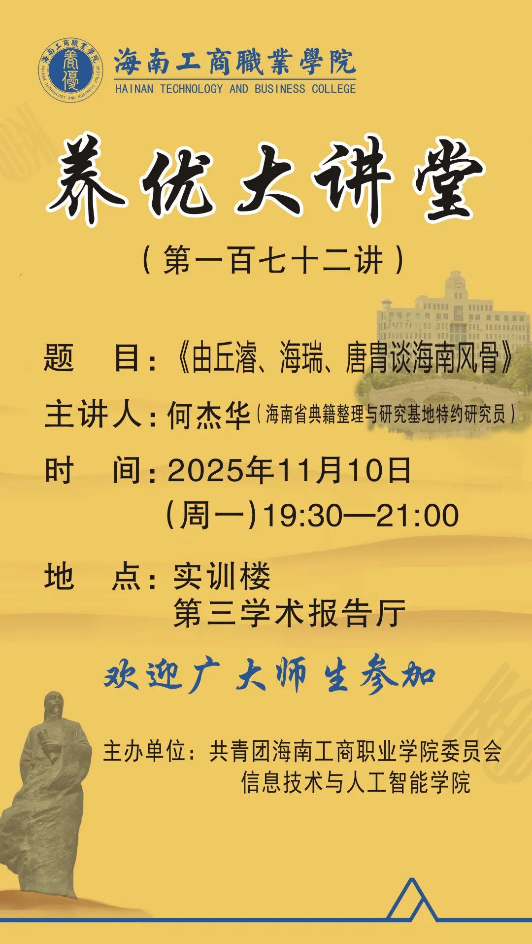 本期大讲堂的主题为:《由丘濬、海瑞、唐胄谈海南风骨》